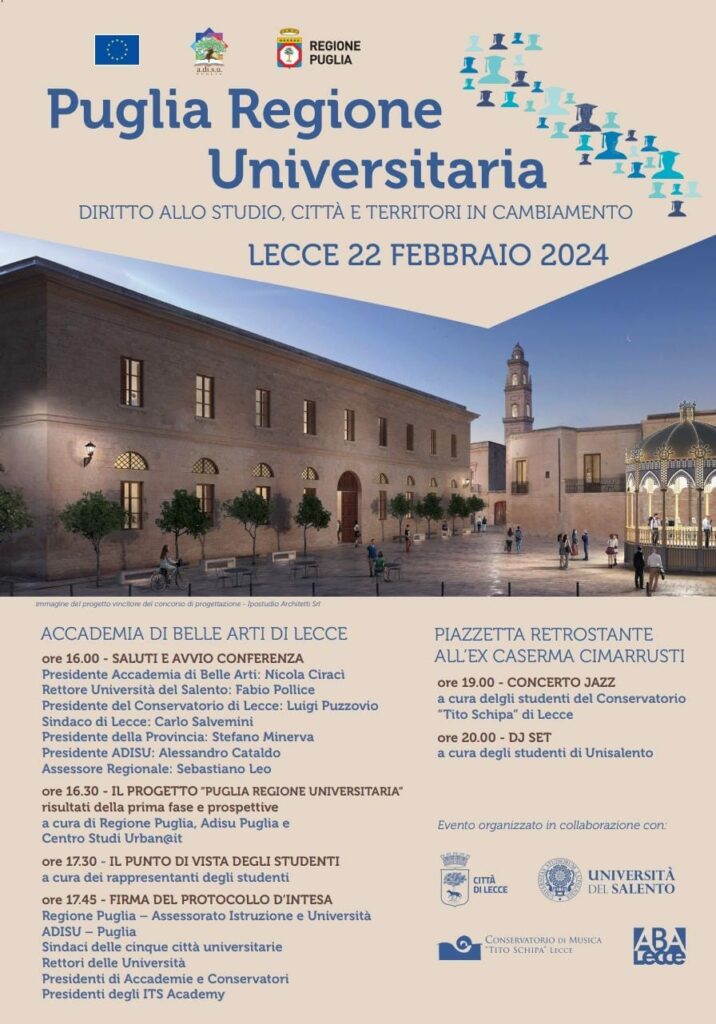 Il 22 febbraio a Lecce è stato firmato il Protocollo di Intesa della seconda fase biennale della ricerca Puglia Regione Universitaria avviato nel 2021 tra Regione Puglia, Adisu Puglia, le Università pugliesi e le città di Bari, Brindisi, Foggia, Lecce, Taranto con l’obiettivo di rafforzare il dialogo tra le Università e i sistemi urbani e definire strategie condivise per affrontare la domanda di alloggi e servizi per gli studenti.