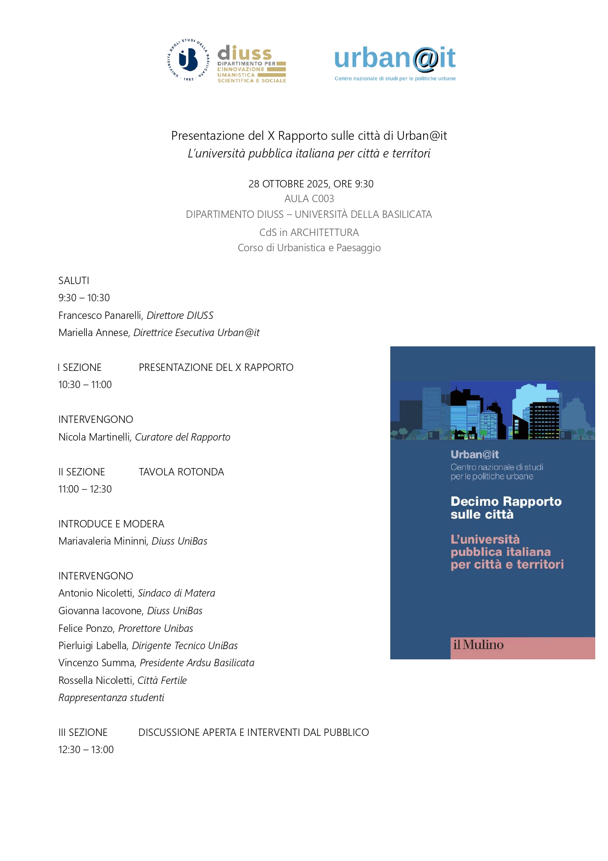 Il prossimo evento si svolgerà a Matera il giorno 28 ottobre 2025 dalle ore 9.30 presso l’AULA C003 del Dipartimento DIUSS | Università della Basilicata – CdS in Architettura, Corso di Urbanistica e Paesaggio